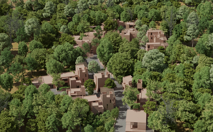 Over 70 percent of Dhun is preserved as a bioreserve of forests, grasslands, orchards, and groves. Water systems of ponds, swales, and revived wells support soil, wildlife, and seasonal change, with trails allowing people to move through the landscape.